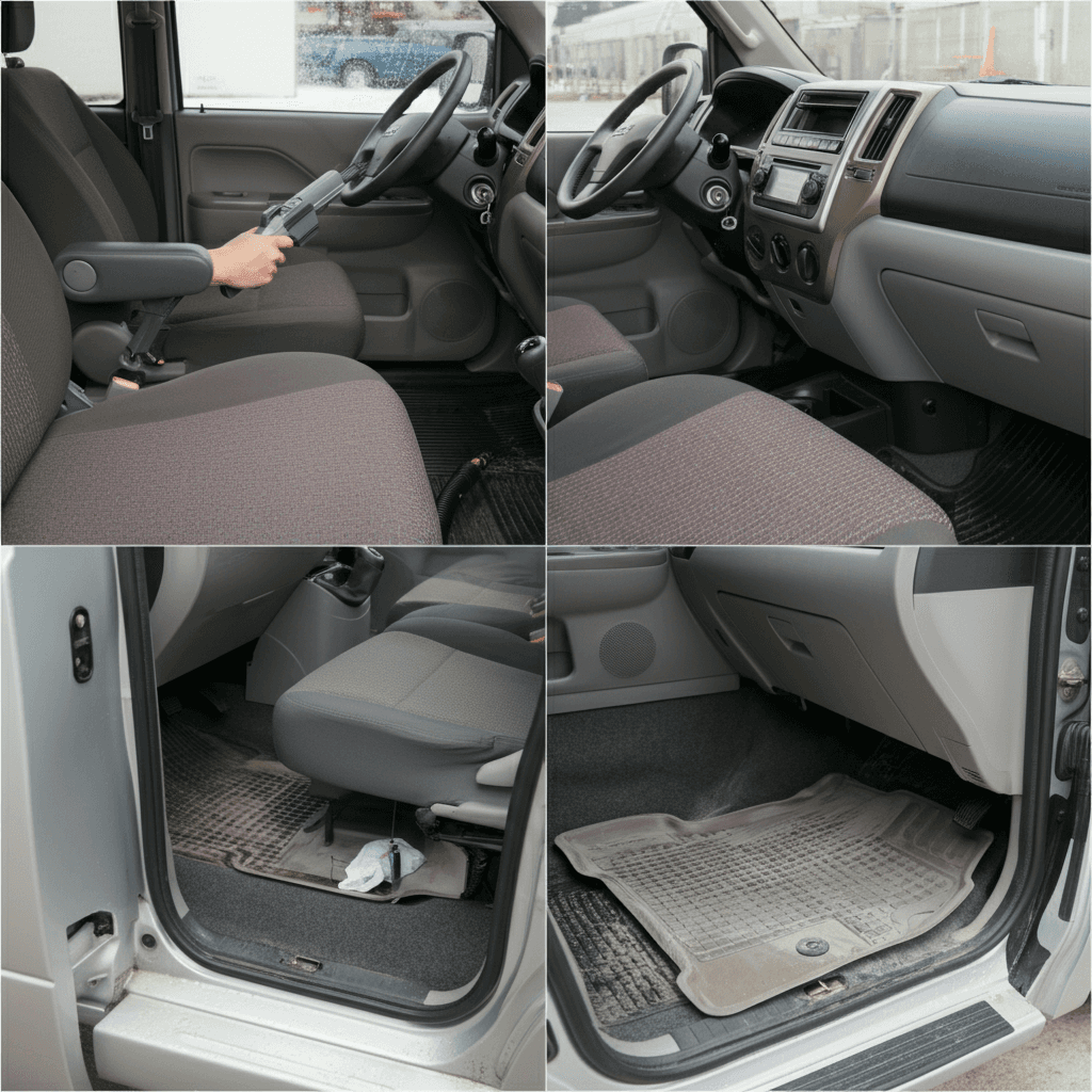 ハイゼットカーゴは第一印象が査定の8割を決めます。シート隙間のゴミ除去、マット洗浄、樹脂パーツ艶出しで新車級の清潔感に。特に臭いゼロなら「禁煙車」扱いで+5~8万円UP。