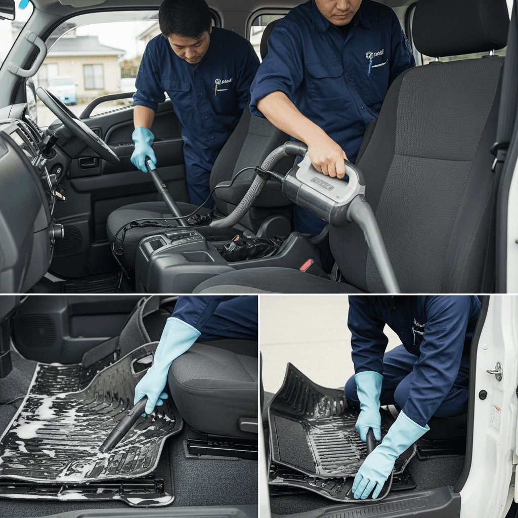 ハイゼットトラックは第一印象が査定の8割を決めます。シート隙間のゴミ除去、マット洗浄、樹脂パーツ艶出しで新車級の清潔感に。特に臭いゼロなら「禁煙車」扱いで+5~8万円UP。
