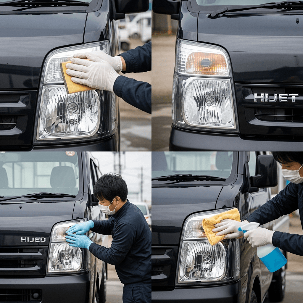 ハイゼットトラックはヘッドライトの黄ばみとボディの鉄粉が第一印象を損ねます。研磨+鉄粉除去クリーナー+ワックスで輝きを取り戻せば「程度良好」と判断され+4~7万円の効果。