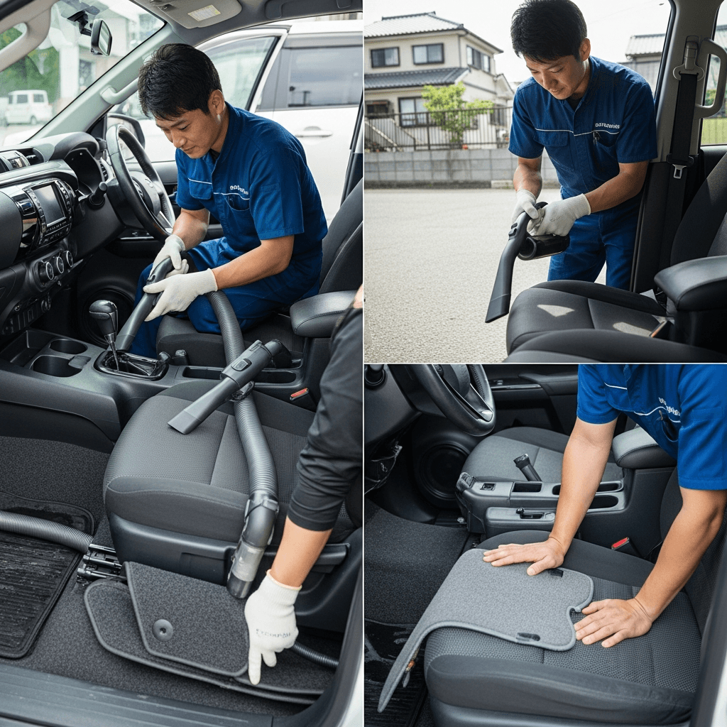 ハイラックスは第一印象が査定の8割を決めます。シート隙間のゴミ除去、マット洗浄、樹脂パーツ艶出しで新車級の清潔感に。特に臭いゼロなら「禁煙車」扱いで+5~8万円UP。