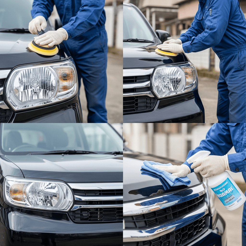 ヒミコはヘッドライトの黄ばみとボディの鉄粉が第一印象を損ねます。研磨+鉄粉除去クリーナー+ワックスで輝きを取り戻せば「程度良好」と判断され+4~7万円の効果。