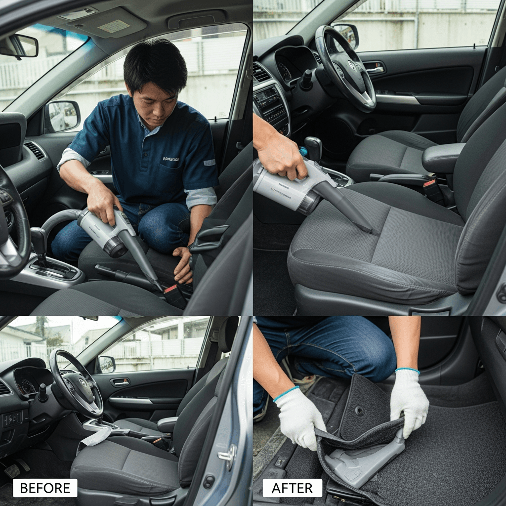 ヒミコは第一印象が査定の8割を決めます。シート隙間のゴミ除去、マット洗浄、樹脂パーツ艶出しで新車級の清潔感に。特に臭いゼロなら「禁煙車」扱いで+5~8万円UP。