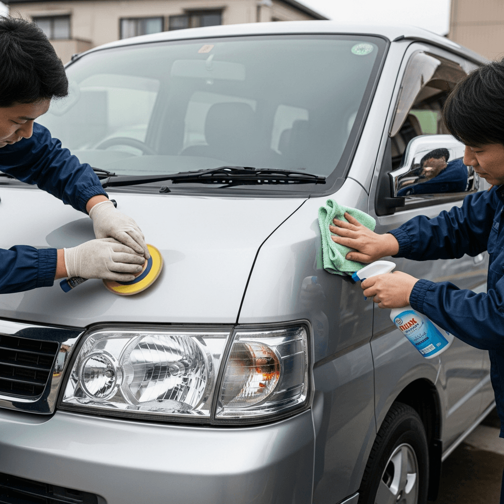ホーミーはヘッドライトの黄ばみとボディの鉄粉が第一印象を損ねます。研磨+鉄粉除去クリーナー+ワックスで輝きを取り戻せば「程度良好」と判断され+4~7万円の効果。