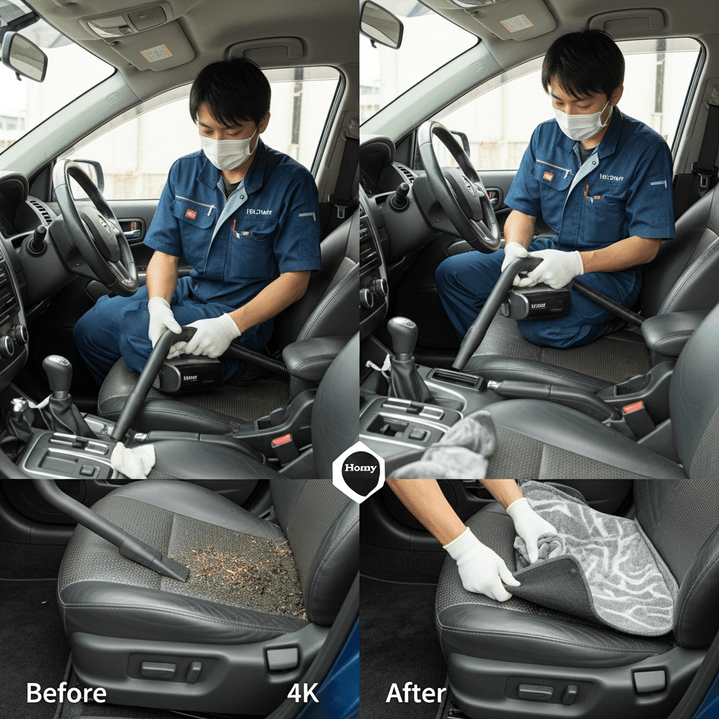 ホーミーは第一印象が査定の8割を決めます。シート隙間のゴミ除去、マット洗浄、樹脂パーツ艶出しで新車級の清潔感に。特に臭いゼロなら「禁煙車」扱いで+5~8万円UP。