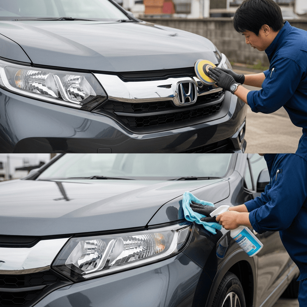 ホライゾンはヘッドライトの黄ばみとボディの鉄粉が第一印象を損ねます。研磨+鉄粉除去クリーナー+ワックスで輝きを取り戻せば「程度良好」と判断され+4~7万円の効果。