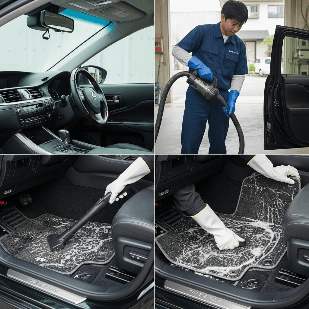 HSは第一印象が査定の8割を決めます。シート隙間のゴミ除去、マット洗浄、樹脂パーツ艶出しで新車級の清潔感に。特に臭いゼロなら「禁煙車」扱いで+5~8万円UP。
