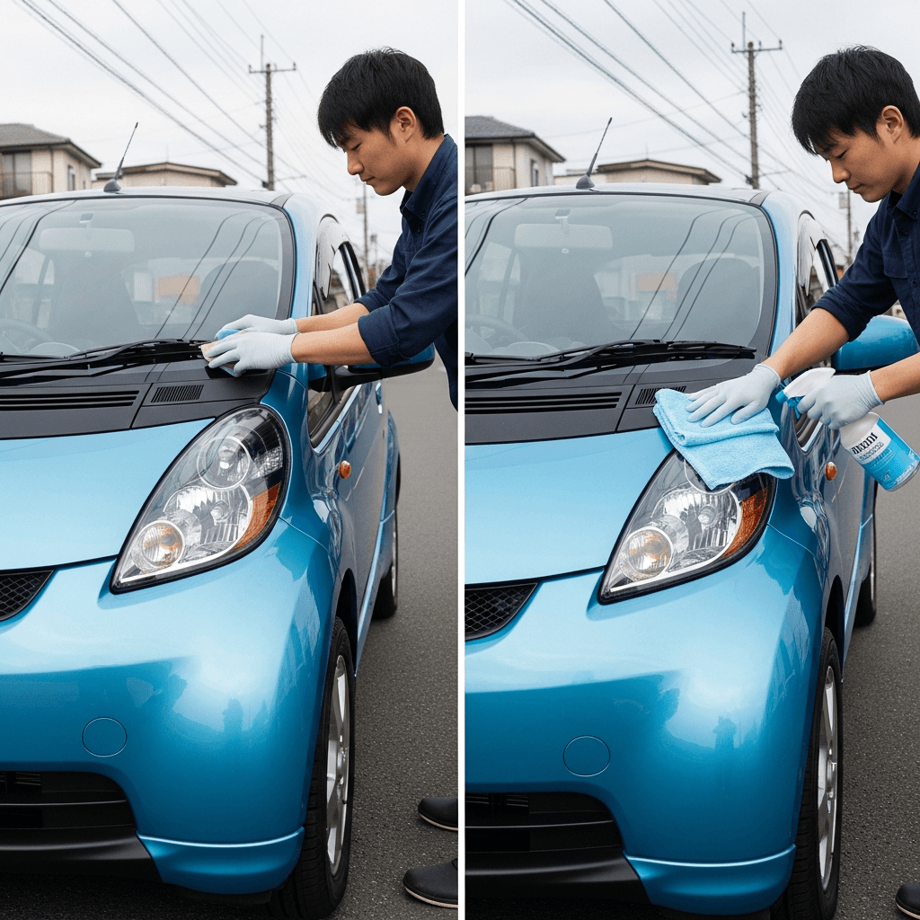 ハイパーミニはヘッドライトの黄ばみとボディの鉄粉が第一印象を損ねます。研磨+鉄粉除去クリーナー+ワックスで輝きを取り戻せば「程度良好」と判断され+4~7万円の効果。