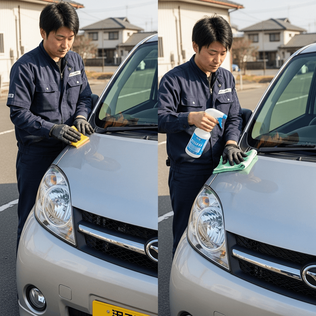 アイ・ミーブ(軽)はヘッドライトの黄ばみとボディの鉄粉が第一印象を損ねます。研磨+鉄粉除去クリーナー+ワックスで輝きを取り戻せば「程度良好」と判断され+4~7万円の効果。