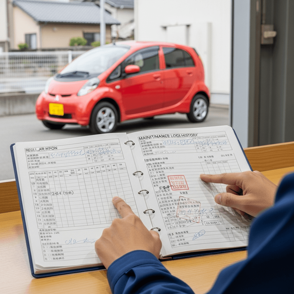 アイ・ミーブ(軽)の整備記録簿に定期点検(12ヶ月・24ヶ月)の履歴が全て記載されていれば「管理の行き届いた車」と高評価。特にエンジンオイル交換履歴は重要で+6~9万円の効果。