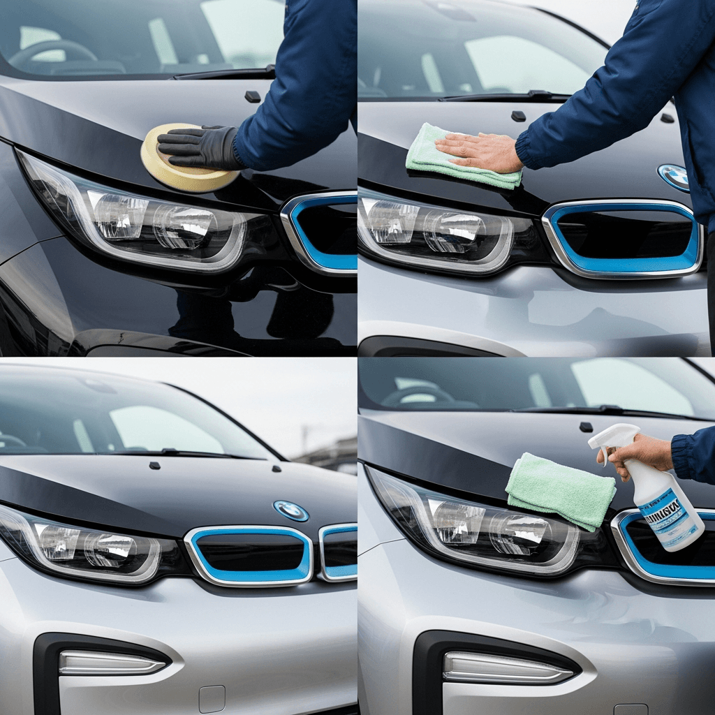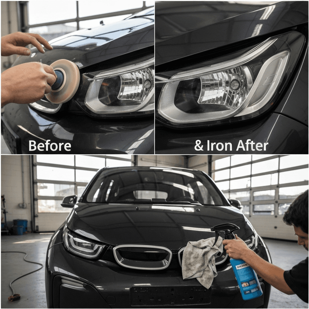 i3はヘッドライトの黄ばみとボディの鉄粉が第一印象を損ねます。研磨+鉄粉除去クリーナー+ワックスで輝きを取り戻せば「程度良好」と判断され+4~7万円の効果。