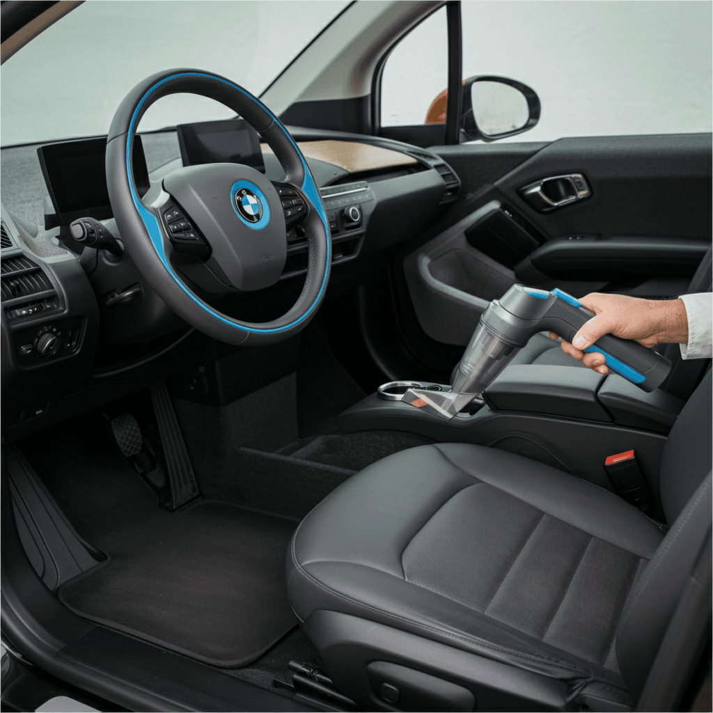 i3は第一印象が査定の8割を決めます。シート隙間のゴミ除去、マット洗浄、樹脂パーツ艶出しで新車級の清潔感に。特に臭いゼロなら「禁煙車」扱いで+5~8万円UP。