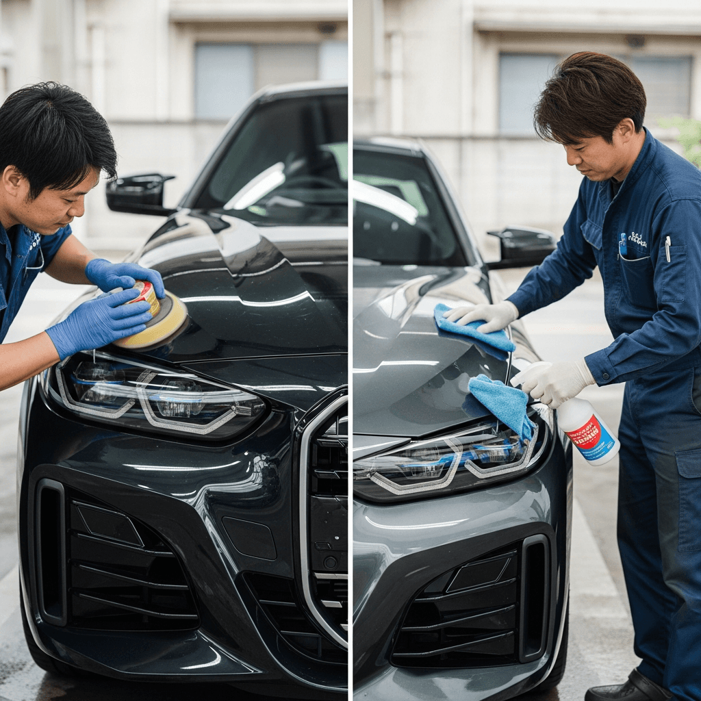 i4はヘッドライトの黄ばみとボディの鉄粉が第一印象を損ねます。研磨+鉄粉除去クリーナー+ワックスで輝きを取り戻せば「程度良好」と判断され+4~7万円の効果。