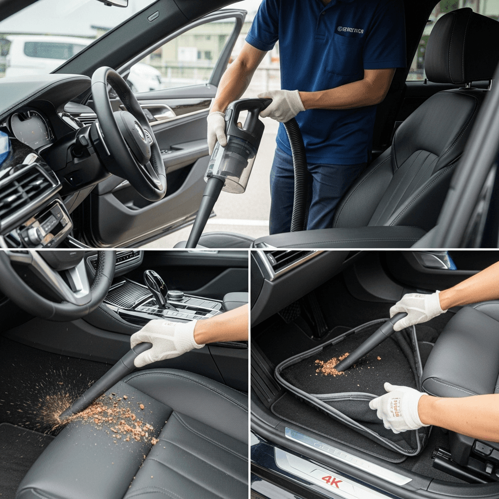 i7は第一印象が査定の8割を決めます。シート隙間のゴミ除去、マット洗浄、樹脂パーツ艶出しで新車級の清潔感に。特に臭いゼロなら「禁煙車」扱いで+5~8万円UP。