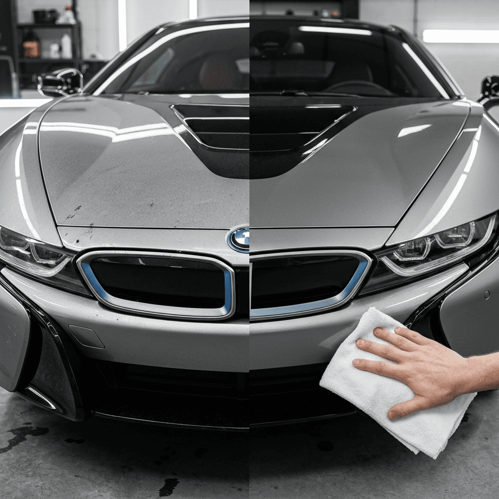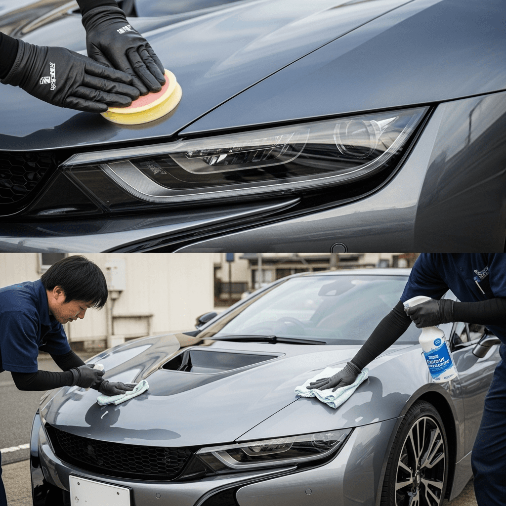 i8はヘッドライトの黄ばみとボディの鉄粉が第一印象を損ねます。研磨+鉄粉除去クリーナー+ワックスで輝きを取り戻せば「程度良好」と判断され+4~7万円の効果。