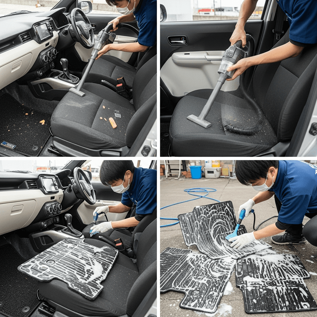 イグニスは第一印象が査定の8割を決めます。シート隙間のゴミ除去、マット洗浄、樹脂パーツ艶出しで新車級の清潔感に。特に臭いゼロなら「禁煙車」扱いで+5~8万円UP。
