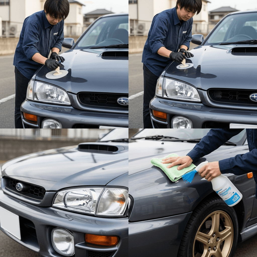 インプレッサクーペはヘッドライトの黄ばみとボディの鉄粉が第一印象を損ねます。研磨+鉄粉除去クリーナー+ワックスで輝きを取り戻せば「程度良好」と判断され+4~7万円の効果。