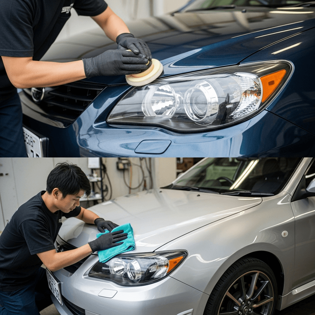 インプレッサハッチバックSTIはヘッドライトの黄ばみとボディの鉄粉が第一印象を損ねます。研磨+鉄粉除去クリーナー+ワックスで輝きを取り戻せば「程度良好」と判断され+4~7万円の効果。