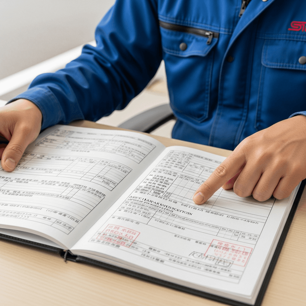 インプレッサスポーツワゴンSTIの整備記録簿に定期点検(12ヶ月・24ヶ月)の履歴が全て記載されていれば「管理の行き届いた車」と高評価。特にエンジンオイル交換履歴は重要で+6~9万円の効果。