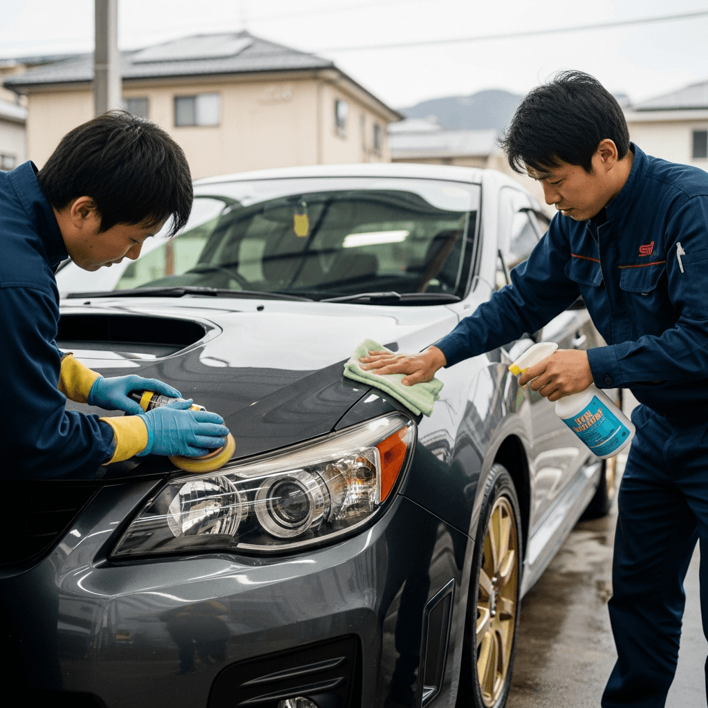 インプレッサスポーツワゴンSTIはヘッドライトの黄ばみとボディの鉄粉が第一印象を損ねます。研磨+鉄粉除去クリーナー+ワックスで輝きを取り戻せば「程度良好」と判断され+4~7万円の効果。