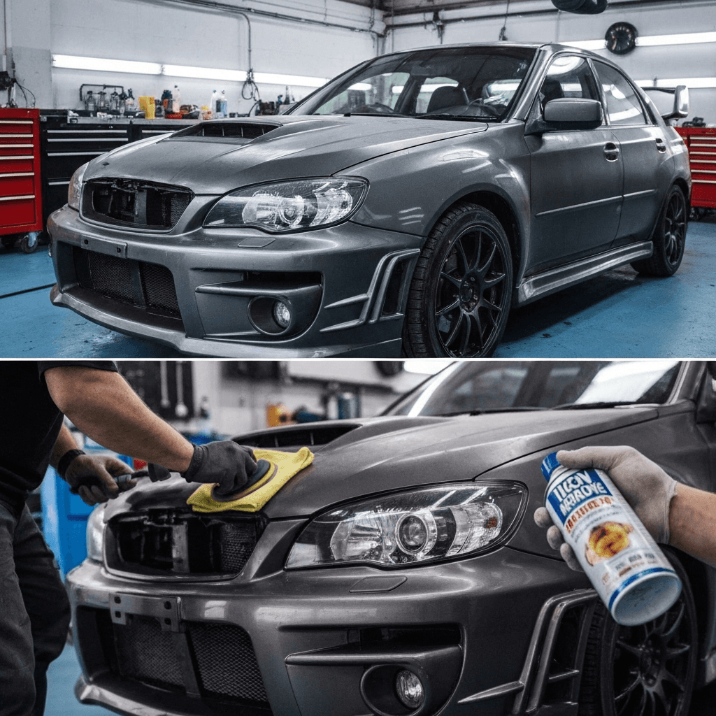インプレッサSTIはヘッドライトの黄ばみとボディの鉄粉が第一印象を損ねます。研磨+鉄粉除去クリーナー+ワックスで輝きを取り戻せば「程度良好」と判断され+4~7万円の効果。