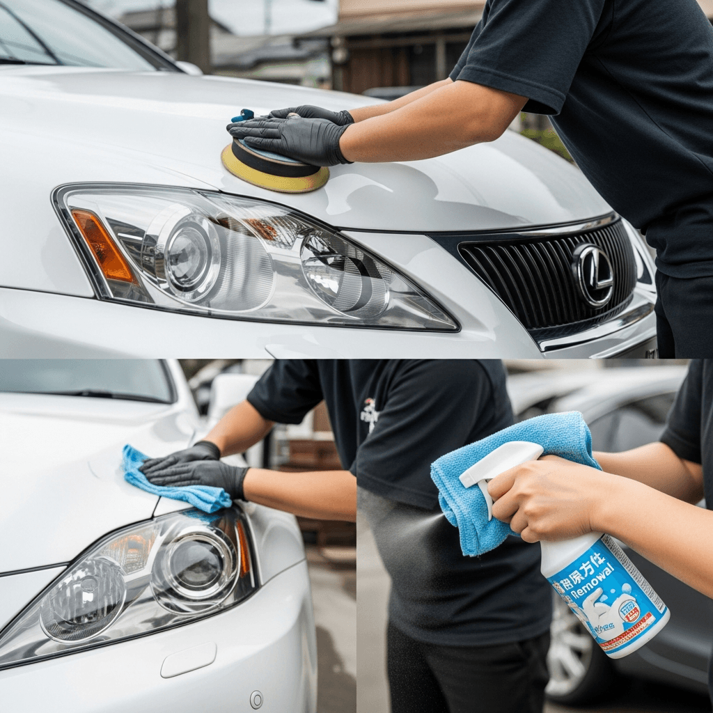 IS Fはヘッドライトの黄ばみとボディの鉄粉が第一印象を損ねます。研磨+鉄粉除去クリーナー+ワックスで輝きを取り戻せば「程度良好」と判断され+4~7万円の効果。