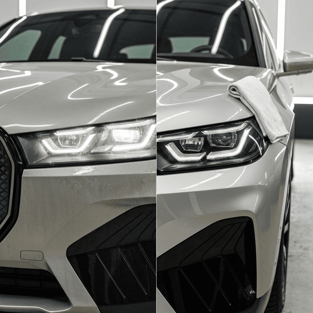 iXはヘッドライトの黄ばみとボディの鉄粉が第一印象を損ねます。研磨+鉄粉除去クリーナー+ワックスで輝きを取り戻せば「程度良好」と判断され+4~7万円の効果。