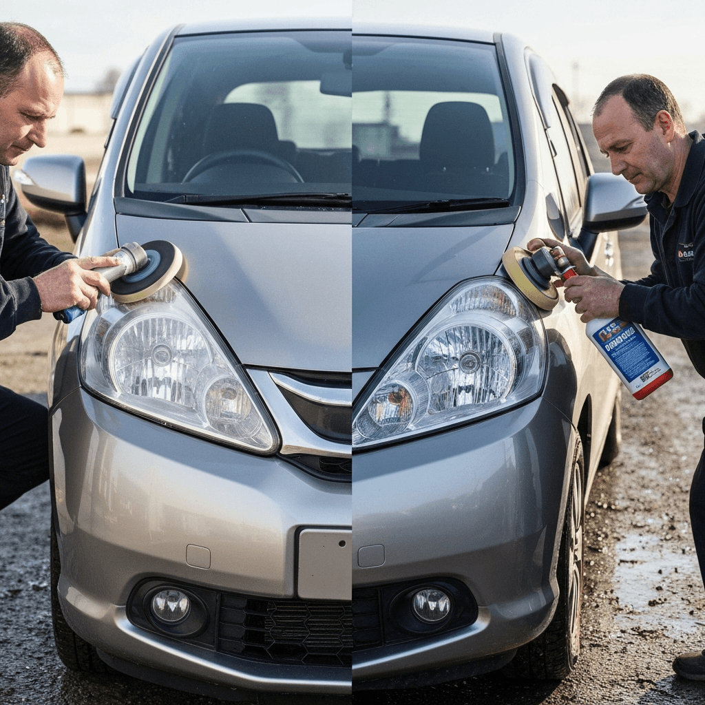 ジャズはヘッドライトの黄ばみとボディの鉄粉が第一印象を損ねます。研磨+鉄粉除去クリーナー+ワックスで輝きを取り戻せば「程度良好」と判断され+4~7万円の効果。
