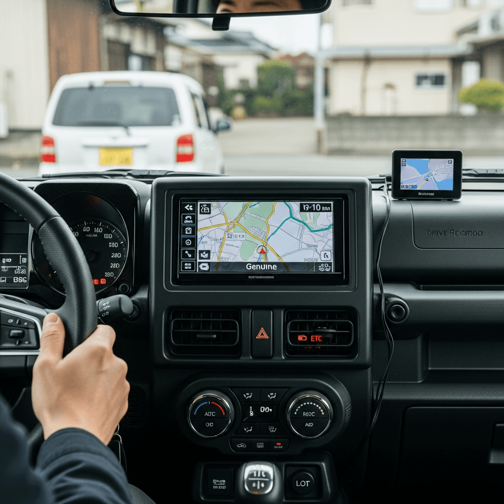 ジムニーワイドに純正ナビ、ETC、ドライブレコーダーが装着されていれば「すぐ使える装備完璧」で+5~8万円UP。特に軽は装備の有無が査定に直結します。