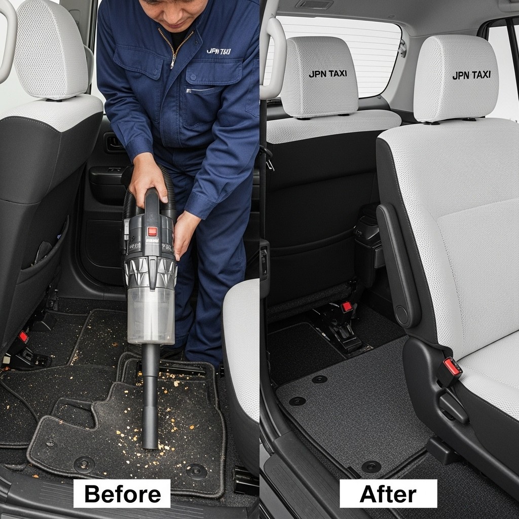 JPN TAXIは第一印象が査定の8割を決めます。シート隙間のゴミ除去、マット洗浄、樹脂パーツ艶出しで新車級の清潔感に。特に臭いゼロなら「禁煙車」扱いで+5~8万円UP。