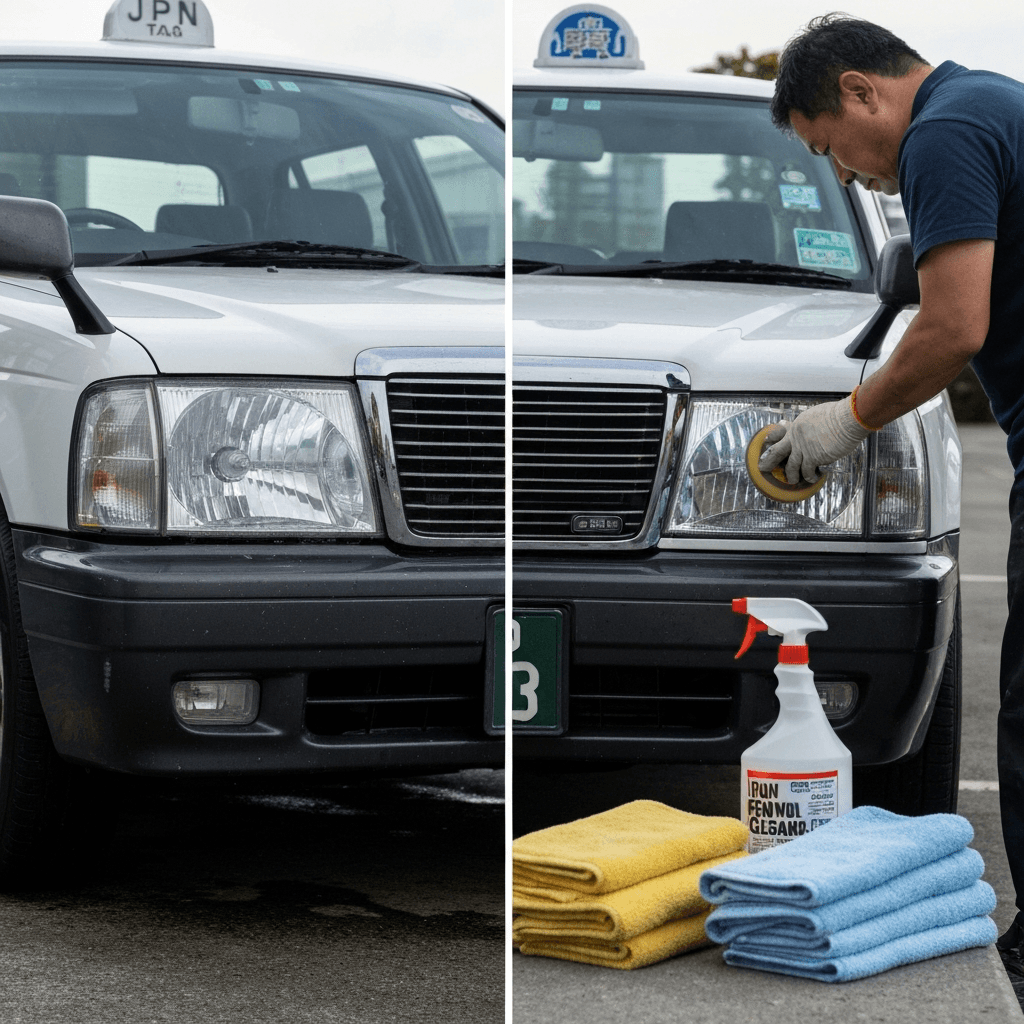 JPN TAXIはヘッドライトの黄ばみとボディの鉄粉が第一印象を損ねます。研磨+鉄粉除去クリーナー+ワックスで輝きを取り戻せば「程度良好」と判断され+4~7万円の効果。