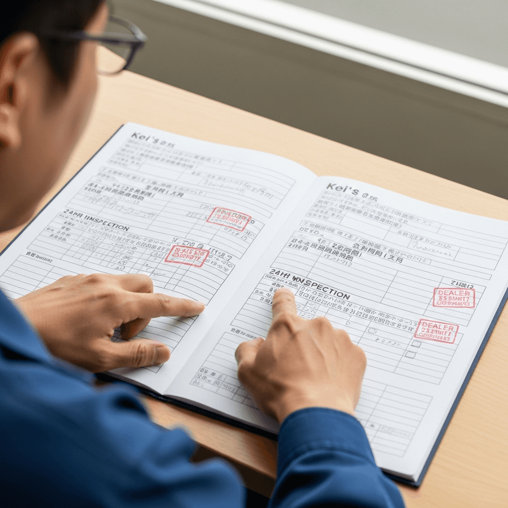 Keiの整備記録簿に定期点検(12ヶ月・24ヶ月)の履歴が全て記載されていれば「管理の行き届いた車」と高評価。特にエンジンオイル交換履歴は重要で+6~9万円の効果。