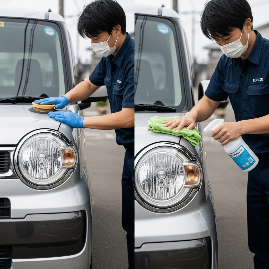 Keiはヘッドライトの黄ばみとボディの鉄粉が第一印象を損ねます。研磨+鉄粉除去クリーナー+ワックスで輝きを取り戻せば「程度良好」と判断され+4~7万円の効果。