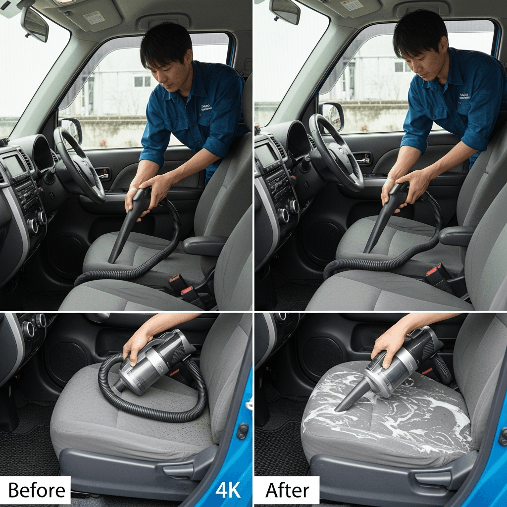 Keiは第一印象が査定の8割を決めます。シート隙間のゴミ除去、マット洗浄、樹脂パーツ艶出しで新車級の清潔感に。特に臭いゼロなら「禁煙車」扱いで+5~8万円UP。