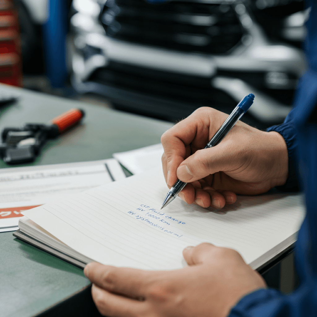 整備記録簿にCVTフルード交換やHVシステム診断の履歴を明記。特に「10万km時CVT交換済」「バッテリー冷却系点検済」の記載があれば査定士の信頼度が急上昇し、+6~10万円の価値創出が可能です。