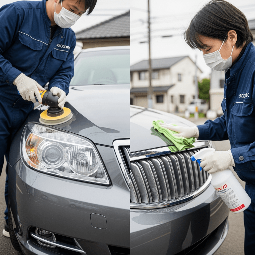 ラセードはヘッドライトの黄ばみとボディの鉄粉が第一印象を損ねます。研磨+鉄粉除去クリーナー+ワックスで輝きを取り戻せば「程度良好」と判断され+4~7万円の効果。