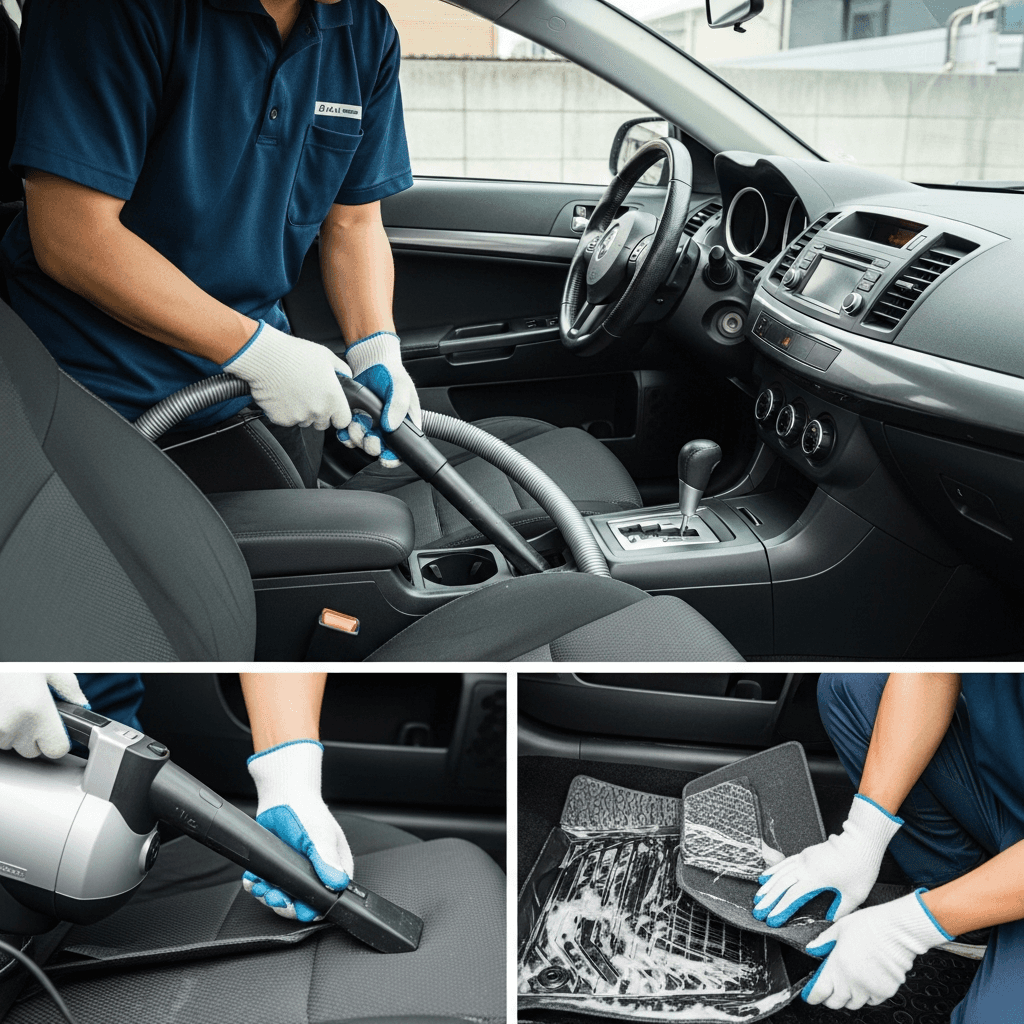 ランサーは第一印象が査定の8割を決めます。シート隙間のゴミ除去、マット洗浄、樹脂パーツ艶出しで新車級の清潔感に。特に臭いゼロなら「禁煙車」扱いで+5~8万円UP。