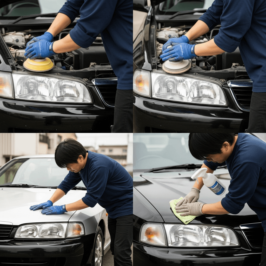 ランサーセディアはヘッドライトの黄ばみとボディの鉄粉が第一印象を損ねます。研磨+鉄粉除去クリーナー+ワックスで輝きを取り戻せば「程度良好」と判断され+4~7万円の効果。