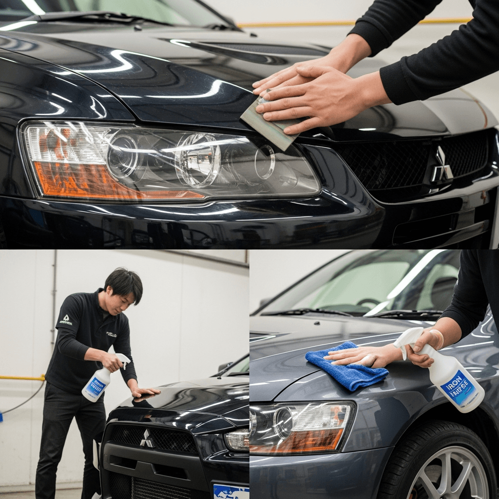ランサーエボリューションはヘッドライトの黄ばみとボディの鉄粉が第一印象を損ねます。研磨+鉄粉除去クリーナー+ワックスで輝きを取り戻せば「程度良好」と判断され+4~7万円の効果。