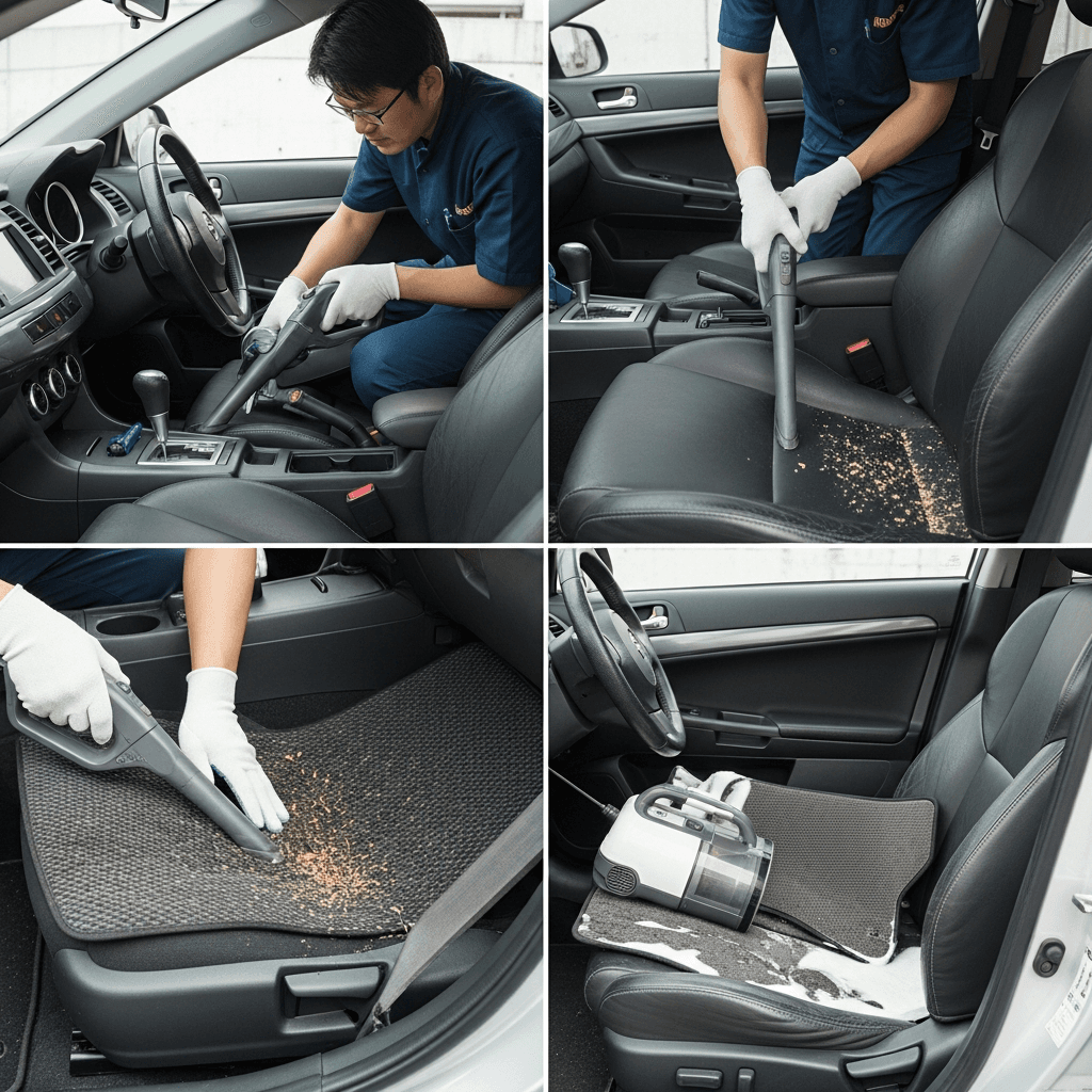ランサーエボリューションは第一印象が査定の8割を決めます。シート隙間のゴミ除去、マット洗浄、樹脂パーツ艶出しで新車級の清潔感に。特に臭いゼロなら「禁煙車」扱いで+5~8万円UP。