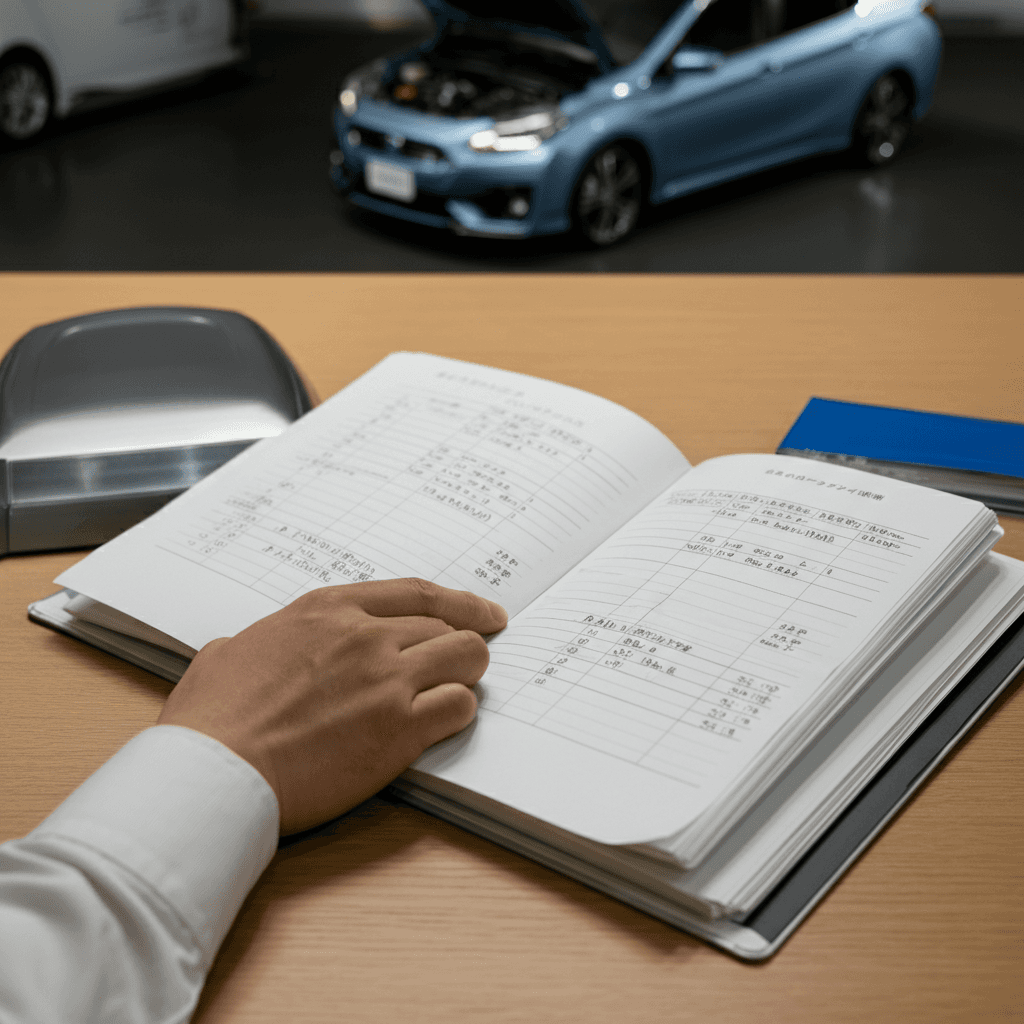 ランティスクーペの整備記録簿に定期点検(12ヶ月・24ヶ月)の履歴が全て記載されていれば「管理の行き届いた車」と高評価。特にエンジンオイル交換履歴は重要で+6~9万円の効果。