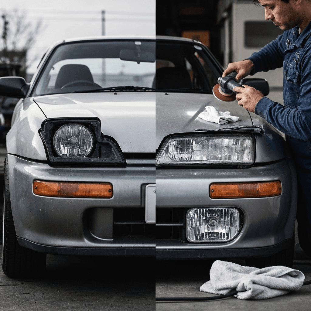 ランティスクーペはヘッドライトの黄ばみとボディの鉄粉が第一印象を損ねます。研磨+鉄粉除去クリーナー+ワックスで輝きを取り戻せば「程度良好」と判断され+4~7万円の効果。