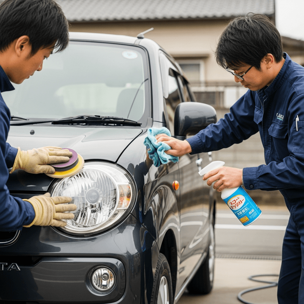 ラピュタはヘッドライトの黄ばみとボディの鉄粉が第一印象を損ねます。研磨+鉄粉除去クリーナー+ワックスで輝きを取り戻せば「程度良好」と判断され+4~7万円の効果。