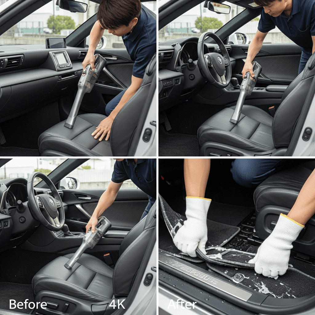 LCコンバーチブルは第一印象が査定の8割を決めます。シート隙間のゴミ除去、マット洗浄、樹脂パーツ艶出しで新車級の清潔感に。特に臭いゼロなら「禁煙車」扱いで+5~8万円UP。