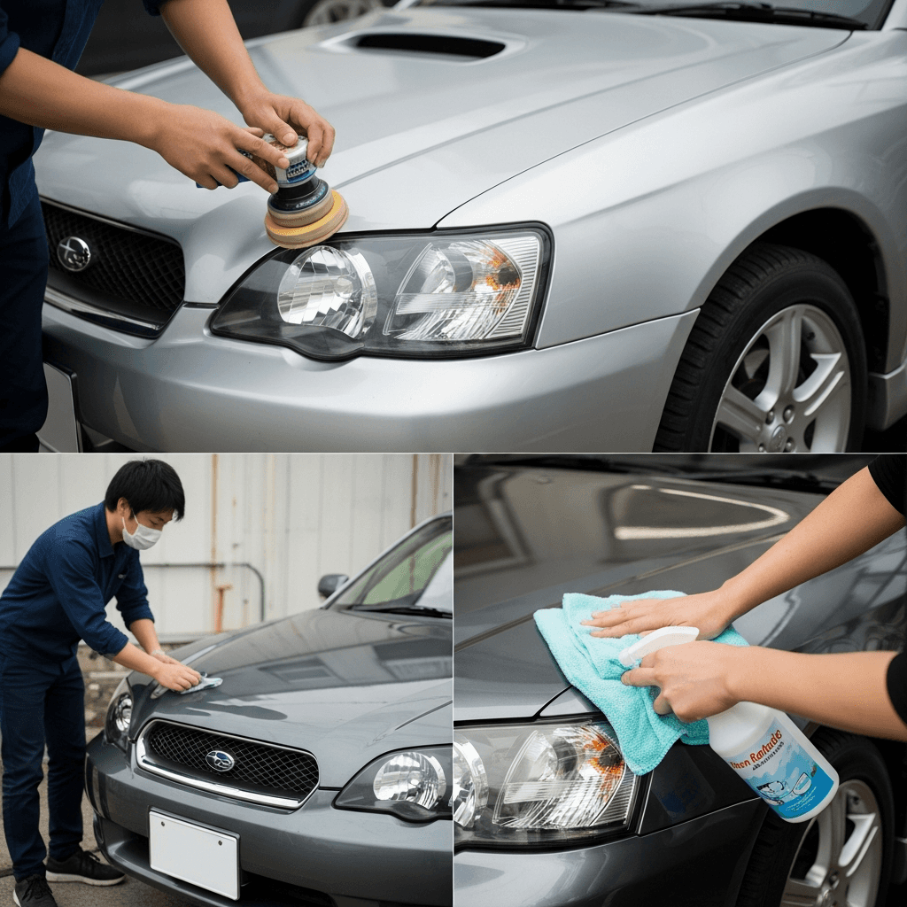 レガシィB4はヘッドライトの黄ばみとボディの鉄粉が第一印象を損ねます。研磨+鉄粉除去クリーナー+ワックスで輝きを取り戻せば「程度良好」と判断され+4~7万円の効果。