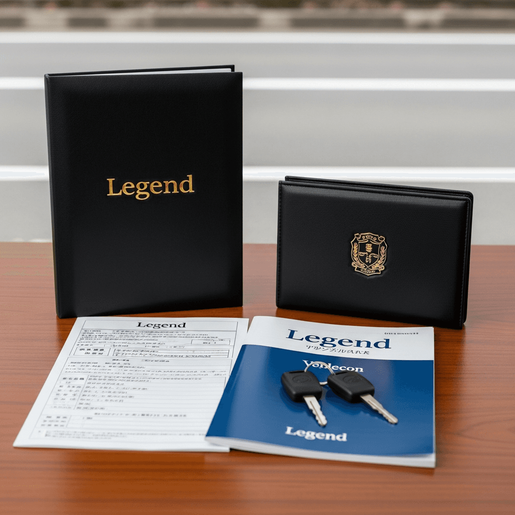 レジェンドは高級セダンとして書類完備が必須。整備記録簿、取扱説明書、スペアキー2本が揃っていれば「ワンオーナー級の管理」で+4~7万円UP。特にスペアキーは重要。