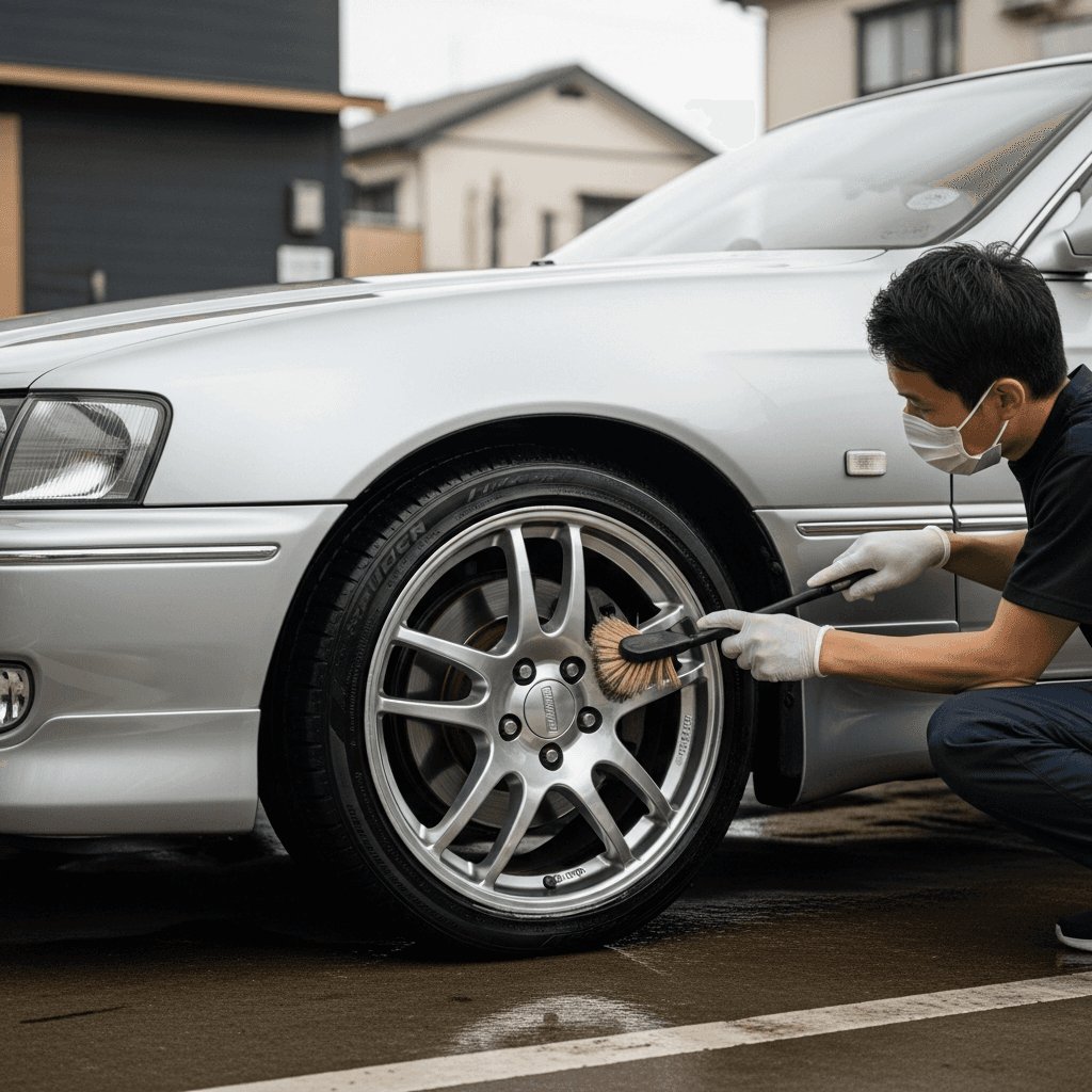 セダンは純正アルミホイールの傷が目立ちやすい。ホイールクリーナーで洗浄+タイヤ溝5mm以上確保で「足回り良好」評価。特にレジェンドクーペは高級感が重要で+6~9万円の効果。