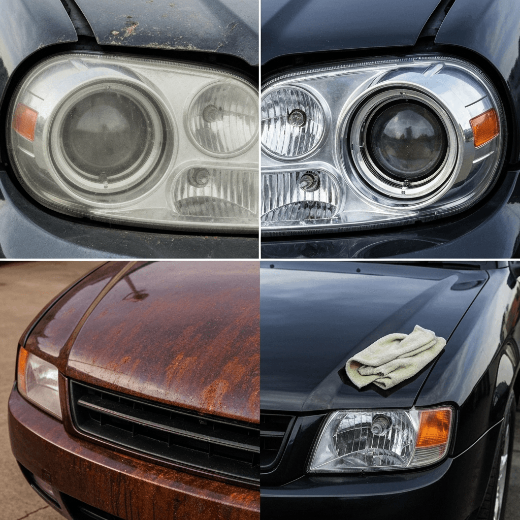 ヘッドライト黄ばみ除去+ボディ鉄粉除去で輝き復活!