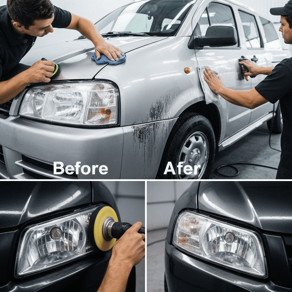 リベロカーゴワゴンはヘッドライトの黄ばみとボディの鉄粉が第一印象を損ねます。研磨+鉄粉除去クリーナー+ワックスで輝きを取り戻せば「程度良好」と判断され+4~7万円の効果。