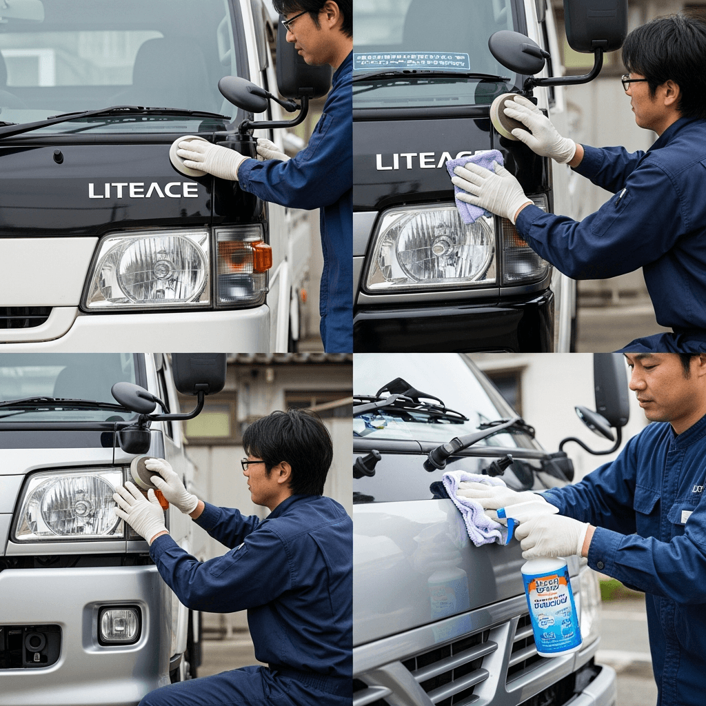 ライトエーストラックはヘッドライトの黄ばみとボディの鉄粉が第一印象を損ねます。研磨+鉄粉除去クリーナー+ワックスで輝きを取り戻せば「程度良好」と判断され+4~7万円の効果。