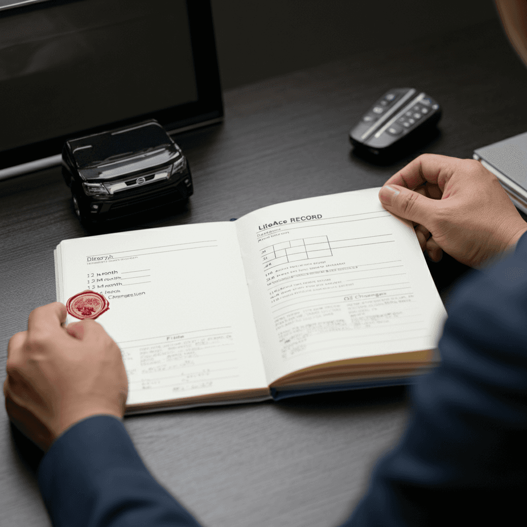 ライトエースバンの整備記録簿に定期点検(12ヶ月・24ヶ月)の履歴が全て記載されていれば「管理の行き届いた車」と高評価。特にエンジンオイル交換履歴は重要で+6~9万円の効果。